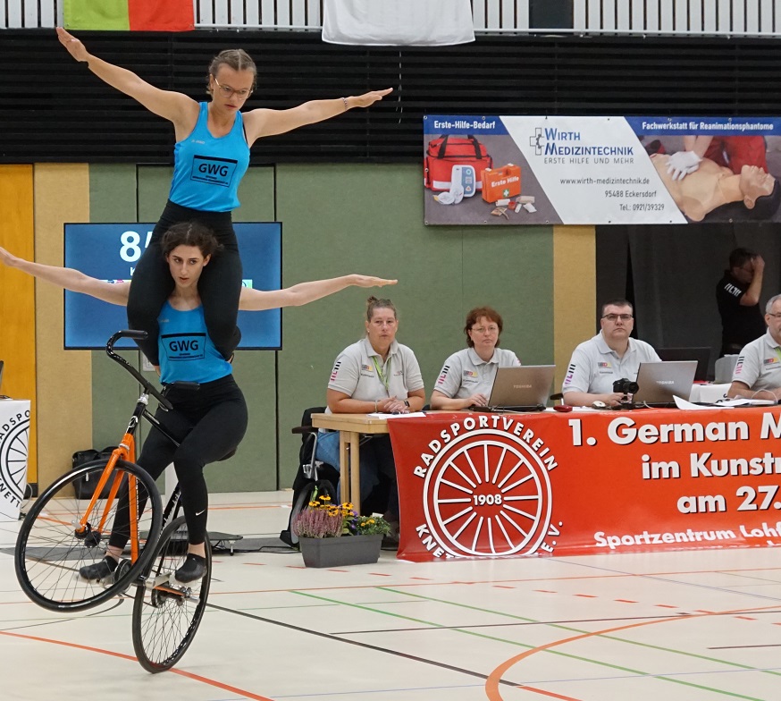 Am Wettkampftag selbst hatten die beiden Glück, dass sie eine sehr frühe Startzeit hatten. Bereits um 9:50 konnten sie mit ihrer Kür starten, sodass sich die Anspannung über den Tag gar nicht erst aufbauen konnte. Das zeigte sich dann auch in ihrer Kür. Den ersten Teil auf einem Rad fuhren sie sehr souverän und mit sehr wenig Abzügen. Auch der zweite Teil auf zwei Rädern war eigentlich sehr gut, jedoch gab es bei einigen Wechseln zwischen den Übungen Probleme beim Herstellen der Griffverbindung, wodurch jedes Mal einige Sekunden verloren gingen. Am Ende fehlte dann etwas Zeit, sodass zwei Übungen nicht mehr in die Wertung kamen.