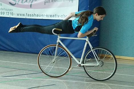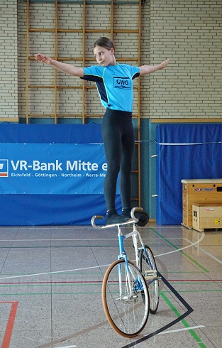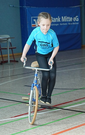 Einen entspannten Start hatte das Duo Emma Kriebel und Milla Preuß im 2er Kunstradsport der Schülerinnen. Als Einzelstarter waren sie an Platz 1 gesetzt und nutzten so diese Gelegenheit als gelungene Probe für die Landesmeisterschaft.